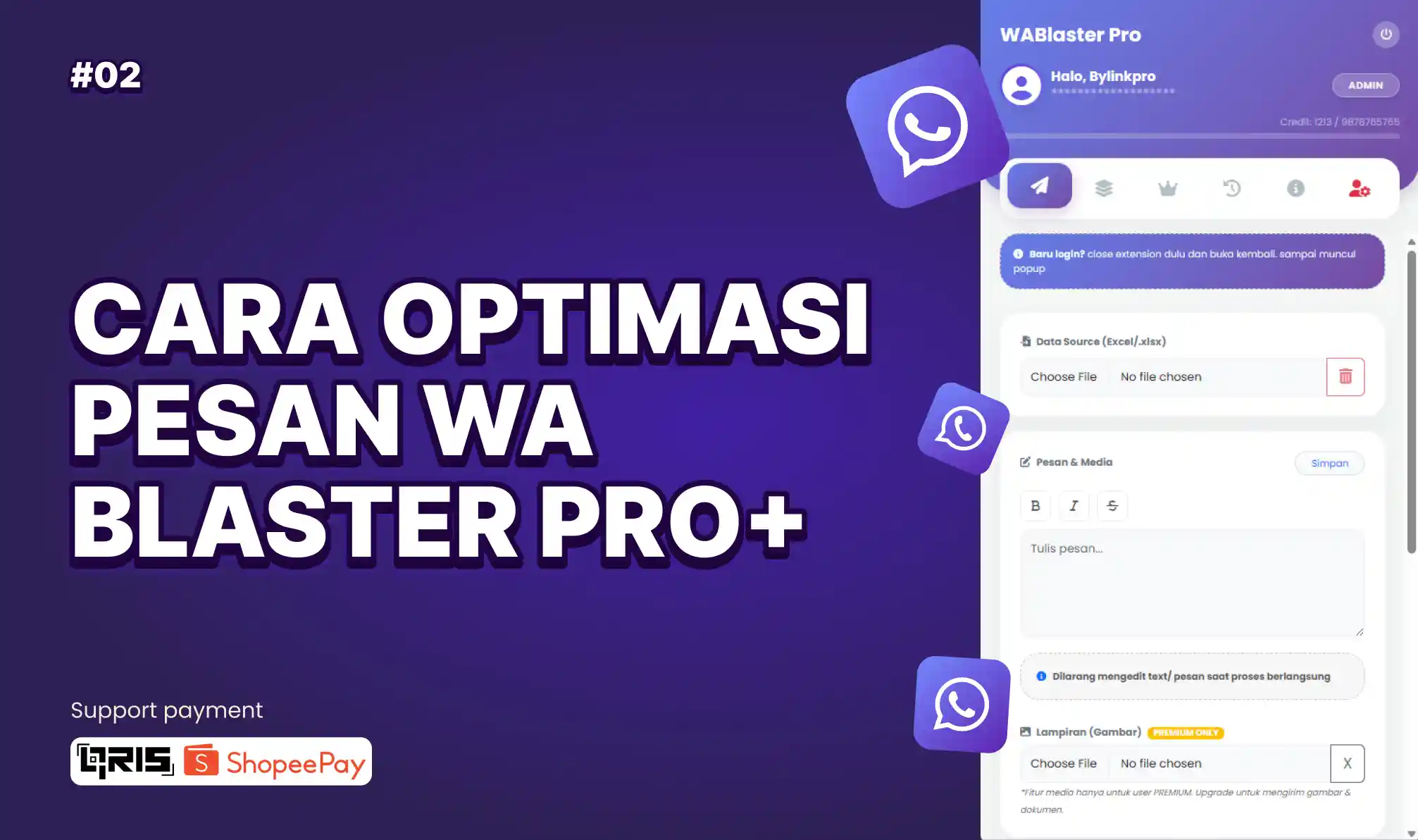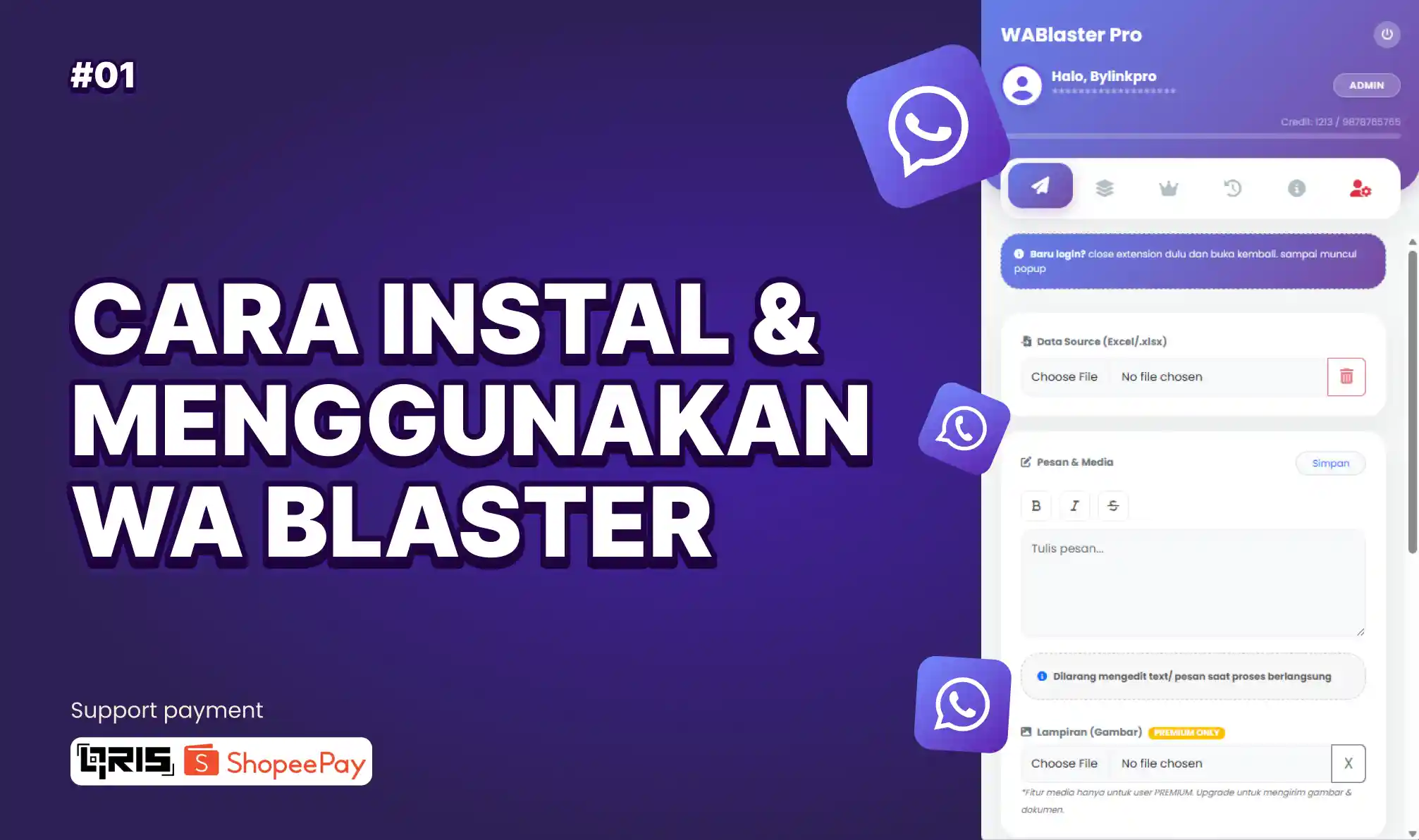 Ketika login pertama kali di extension, pastikan di close extension dan buka kembali. ketika extension WA Blaster muncul popup maka WA Blaster siap di gunakan